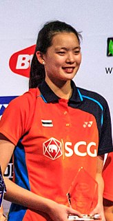 Jongkolphan Kititharakul is a Thai badminton player who specializes in doubles. She was the women's doubles gold medalist at the 2017 Southeast Asian Games, also part of the team that clinched the women's team gold medals in 2015, 2017 and 2019.