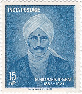 Subramania Bharati, was a Tamil writer, poet, journalist, Indian independence activist, social reformer and polyglot. Popularly known as "Mahakavi Bharathi", he was a pioneer of modern Tamil poetry and is considered one of the greatest Tamil literary figures of all time. His numerous works included fiery songs kindling patriotism during the Indian Independence movement. He fought for the emancipation of women, against child marriage, stood for reforming Brahminism and religion. He was also in solidarity with Dalits and Muslims.
