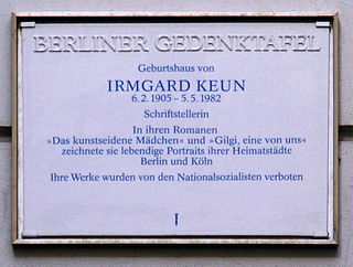 Irmgard Keun was a German novelist. She is noted for her portrayals of the life of women and is “...often reduced to the bold sexuality of her writing, Keun was a significant author of the late Weimar period and die Neue Sachlichkeit." She was born into an affluent family and was given the autonomy to explore her passions. After her attempts at acting ended at the age of 16, Keun began working as a writer after years of working in Hamburg and Greifswald. Her books were banned by Nazi authorities but gained recognition during the final years of her life.