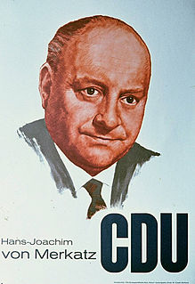 Hans-Joachim von Merkatz was a German politician. He was Federal Minister of Justice from 1956 to 1957. He was a member of the Bundestag from 1949 to 1961. He was a member of the German Party before joining the Christian Democrats in 1960.