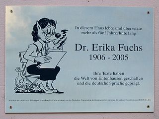 Erika Fuchs, née Petri, was a German translator. She is largely known in Germany due to her translations of American Disney comics, especially Carl Barks' stories about Duckburg and its inhabitants.