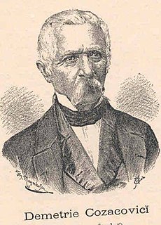 Dimitrie Cozacovici was a Romanian historian. He was one of the founding members of the Romanian Academy. Cozacovici was an Aromanian from Metsovo and one of the main figures of the early Aromanian national movement. He migrated to Wallachia out of national pride feelings and became an officer in the Wallachian army in 1834. His efforts led to the establishment of an Aromanian committee in Bucharest. His surname is sometimes spelled Cosacovici or Cazacovici.