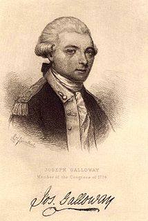 Joseph Galloway was an American politician. He became a Loyalist during the American Revolutionary War, after serving as delegate to the First Continental Congress from Pennsylvania. For much of his career in Pennsylvania politics, he was a close ally of Benjamin Franklin, and he became a leading figure in the colony. As a delegate to the Continental Congress, Galloway was a moderate and proposed a Plan of Union which would have averted a full break from Britain. When that was rejected, he moved increasingly towards Loyalism.
