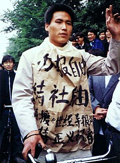 Wu Gan is a Chinese blogger and human rights activist from Fuqing, Fujian who uses the internet name "Super Vulgar Butcher" or "Butcher Wu Gan", and is known for his provocative signs and banners in support of his protests. He was sentenced to eight years in prison in December 2017 for subversion of state power, and is currently incarcerated in Qingliu Prison in Fujian.