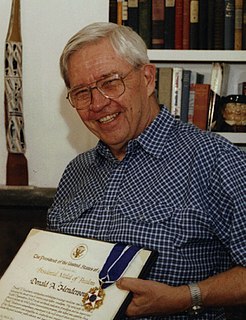 Donald Ainslie Henderson fue un médico, educador, y epidemiólogo quien dirigió el esfuerzo internacional que erradicó la viruela por todo el mundo y inició programas internacionales de vacunación infantil desde 1967 hasta 1977. Desde 1977 hasta 1990, fue el decano de la Escuela de Salud Pública de la Universidad Johns Hopkins. Más tarde, desempeñó un papel clave en el inicio de programas nacionales de preparación de salud pública ante ataques biológicos y desastres nacionales. En el momento de su fallecimiento, fue un profesor y el decano emérito de la Escuela de Salud Pública Bloomberg de la Universidad Johns Hopkins, un profesor de medicina y salúd pública en la Universidad de Pittsburgh, y un académico distinguido en el Centro para Seguridad Sanitaria en el Centro Médico de la Universidad de Pittsburgh.