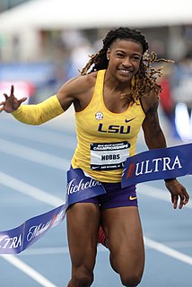 Aleia Hobbs is an American professional track and field athlete specializing in the sprints. She won four national titles in 2018, winning the 60 m at the NCAA Division I Indoor Championships, the 100 m and the 4 × 100 m relay at the NCAA Division I Championships, and the 100 m at the U.S. Championships. Hobbs represented the United States at the 2019 World Relays, anchoring the United States to gold.