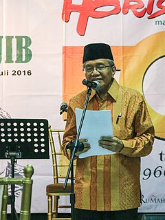 Taufiq Ismail is an Indonesian poet, activist and the editor of the monthly literary magazine "Horison". Ismail figured prominently in Indonesian literature of the post-Sukarno period and is considered one of the pioneers of the "Generation of '66". He completed his education at the University of Indonesia. Before becoming active as a writer, he taught at the Institut Pertanian Bogor. In 1963, he signed the "Cultural Manifesto" as a document that opposed linking art to politics. This cost him his teaching position at the Institut.