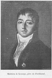 Mathieu Maximilien Prosper Comte de Lesseps was a French diplomat and high ranking public official who served, from 1797 until his death, in numerous foreign and domestic posts. One of his sons, Ferdinand de Lesseps, was the developer and guiding spirit in charge of the construction of the Suez Canal.