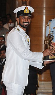 Commander Abhilash Tomy, KC, NM is an Indian naval officer and yachtsman. In 2013, he became the first Indian to complete a solo, non-stop circumnavigation of the world under sail, and he also competed in the 2018 Golden Globe Race. On 10 January 2021, he retired from the Navy by applying for premature retirement from service as he wanted to focus on participating in the Golden Globe Race in 2022.