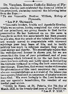 William Joseph Vaughan was a British clergyman who held high office in the Roman Catholic Church as the second bishop of Plymouth.