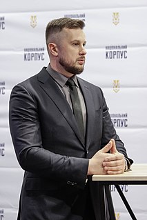 Andriy Yevheniyovych Biletsky is a Ukrainian far-right politician. He is the leader of political party National Corps. He was the first commander of the volunteer militia Azov Battalion, and a co-founder of the nationalist movement Social-National Assembly. From 2014 until 2019 Biletsky was a Member of Ukrainian Parliament.