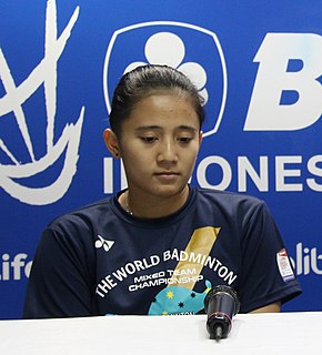 Anggia Shitta Awanda is an Indonesian badminton player specializing in doubles, affiliated with Jaya Raya Jakarta badminton club. She was the 2011 World Junior girls' doubles silver medallist partnered with Shella Devi Aulia.