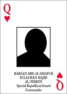 Barzan Abdul Ghafoor Sulaiman Majid al-Tikrit is an Iraqi ex-Republican Guard Commander under Saddam Hussein and member of the Arab Socialist Ba'ath Party. He was the Queen of Hearts in the Most-wanted Iraqi playing cards issued to U.S. military troops to help identify most wanted members of Saddam's government during the Second Iraq War. He was captured on July 23, 2003.