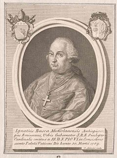 Ignazio Busca was an Italian cardinal and Secretary of State of the Holy See. He was the last son of Lodovico Busca, marquess of Lomagna and Bianca Arconati Visconti. he took a degree in utroque iure in 1759 at the Università La Sapienza of Rome. Relator of the Sacred Consulta and referendary of the tribunal of the Apostolic Signature, he was ordained priest on 20 August 1775. Elected titular archbishop of Emesa, he was consecrated on 17 September 1775 in Frascati, by Henry Benedict Stuart. He was apostolic nuncio in Flanders and apostolic vicar for Netherlands from 1776 to 1785 and later was governor of Rome from 1785 until 1789. Created cardinal in the consistory of 30 March 1789, he received the Galero and the title of Santa Maria della Pace on 3 August 1789. He was appointed Secretary of State by Pope Pius VI in 1796. He participated in the conclave of 1800.