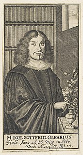 Johann Gottfried Olearius (1635–1711) was a German preacher, musician and horticulturalist. Johann Gottfried was a member of a large, extended family of pastors, theologians, professors and lawyers in Halle, Leipzig and Weissenfels. He was the superintendent and pastor of the Barfüsserkirche. He had been an accomplished church musician and supervised the young Johann Sebastian Bach when he was a church organist at Arnstadt from 1703 to 1707. Olearius also had an interest in horticulture, and the plant genus Olearia was named in his honour by Conrad Moench.