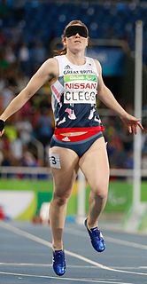Elizabeth Clegg, is a Scottish Paralympic sprinter who has represented both Scotland and Great Britain at international events. She represented Great Britain in the T12 100m and 200m at the 2008 Summer Paralympics, winning a silver medal in the T12 100m race. She won Gold in Rio at the 2016 Paralympic Games in 100m T11 where she broke the world record and T11 200m, beating the previous Paralympic record in the process, thus making her a double Paralympic champion.