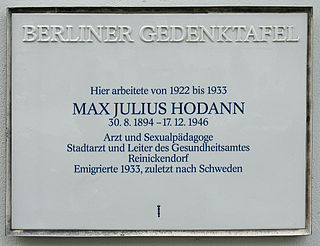 Max Julius Carl Alexander Hodann was a German physician, eugenicist, sex educator and socialist, "the best-known and most controversial medical sex educationalist in the Weimar Republic". He wrote for a working-class readership and for children. After 1933, as a refugee from Nazi Germany, he lived predominantly in Norway and Sweden.