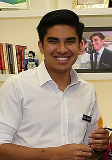 Syed Saddiq bin Syed Abdul Rahman is a Malaysian politician who served as the Minister of Youth and Sports in the Pakatan Harapan (PH) administration under former Prime Minister Mahathir Mohamad from July 2018 to the collapse of the PH administration in February 2020. He has also served as the Member of Parliament (MP) for Muar since May 2018. He later co-founded the Malaysian United Democratic Alliance (MUDA) in September 2020. He was the youngest-serving Minister and youngest to take office at the age of 25 and second youngest MP after P. Prabakaran in the history of Malaysia.